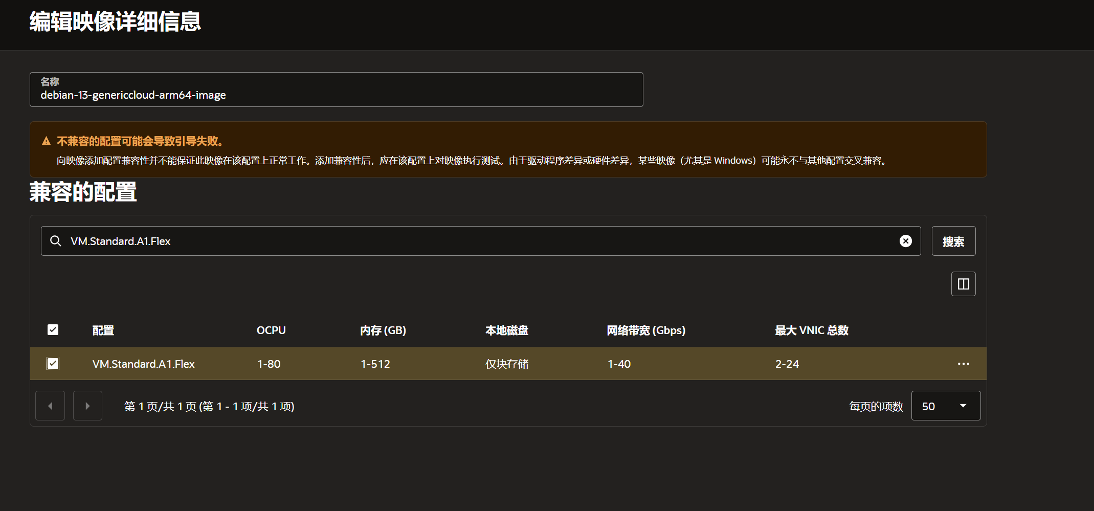默认导入的自定义映像,创建免费的ARM实例的时候在My Image里面无法选择到,需要通过【编辑映像详细信息】,在【兼容的配置】里面搜索下VM.Standard.A1.Flex并勾选上,如下图: