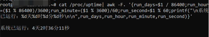 cat /proc/uptime| awk -F. '{run_days=$1 / 86400;run_hour=($1 % 86400)/3600;run_minute=($1 % 3600)/60;run_second=$1 % 60;printf("\n系统已运行:%d天%d时%d分%d秒\n\n",run_days,run_hour,run_minute,run_second)}'