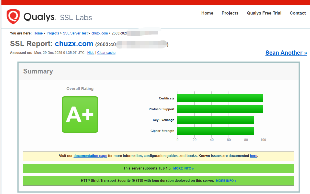 HSTS HSTS是国际互联网工程组织 IETF 正在推行一种新的 Web 安全协议,网站采用 HSTS 后,用户访问时无需手动在地址栏中输入 HTTPS,浏览器会自动采用 HTTPS 访问网站地址,从而保证用户始终访问到网站的加密链接,保护数据传输安全。 HSTS 原理 HSTS 主要是通过服务器发送响应头的方式来控制浏览器操作: 1、首先在服务器响应头中添加 HSTS 响应头:Strict-Transport-Security: max-age=expireTime [; includeSubDomains] [; preload] 此响应头只有在 https 访问返回时才生效,其中[ ]中的参数表示可选; 2、设置 max-age 参数,时间设置不宜过长,建议设置时间为 6 个月; 3、当用户下次使用 HTTP 访问,客户端就会进行内部跳转,并且能够看到 307 Redirect Internel 的响应码; 4、网站服务器变成了 HTTPS 访问源服务器。 开启 HSTS 后网站可以有效防范中间人的攻击,同时也会省去网站 301/302 跳转花费的时间,大大提升安全系数和用户体验。 开启 HSTS 后网站安全系数检测测评 开启 HSTS 以后,可以到 ssllabs 进行测试,网站的安全等级会进一步提升。 开启前等级为:A